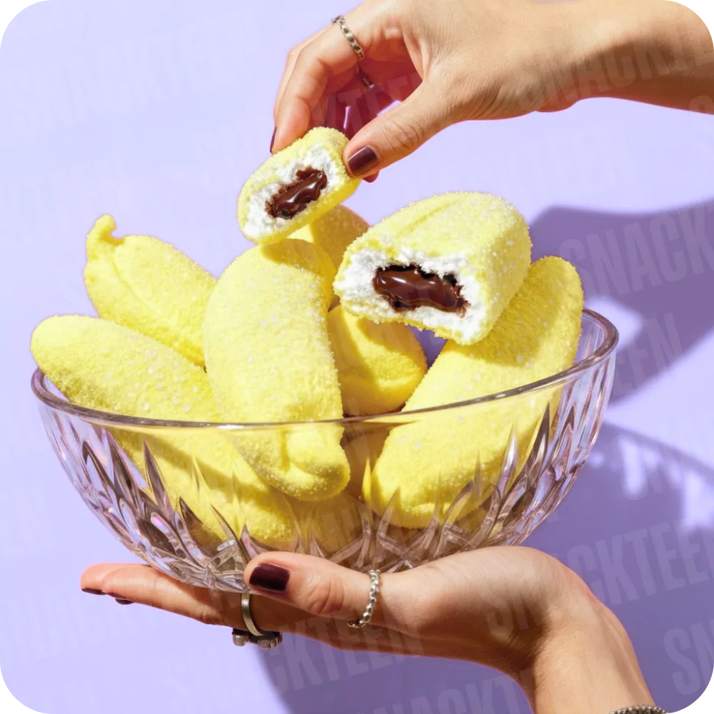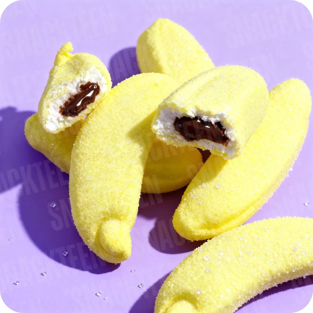Banánový marshmallow plnený čokoládou je lahodná cukrovinka pozostávajúca z marshmallow v tvare banánu plneného lahodnou čokoládou vo vnútri.