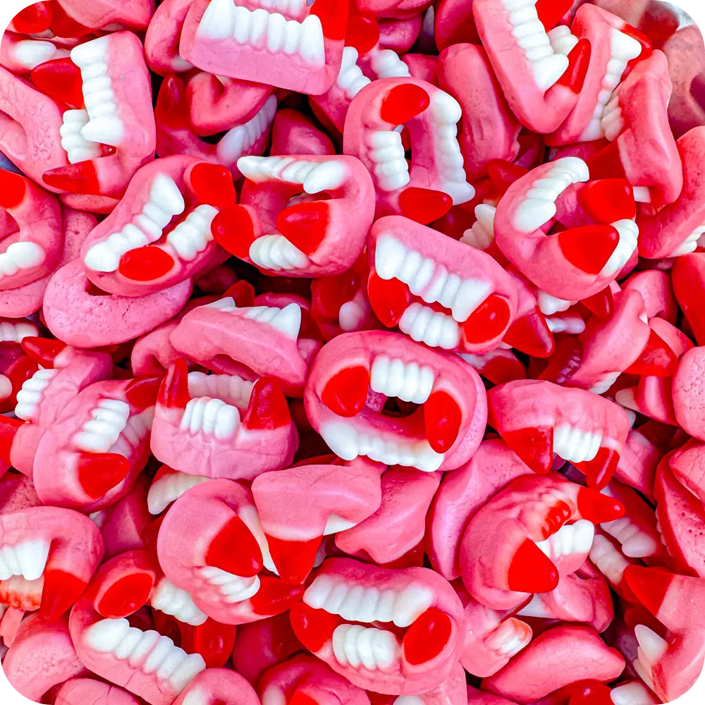 Dracula gumové cukríky sú červené, červeno-biele cukríky v tvare upírieho zuba.