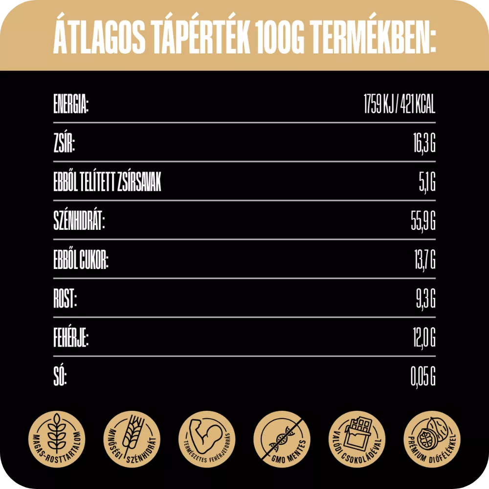 Allergének: gluténtartalmú (zab, rozs), tej, diófélék (kesudió, mandula). Nyomokban földimogyorót, szezámmagot és szóját is tartalmazhat.